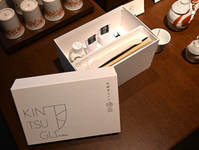 工房で使用している天然漆や筆などが一式揃ったセット「金継ぎコフレ」(16,500円)は売店で販売されています。自宅でも食器を金継ぎすることができ、旅のお土産としてもおすすめです。