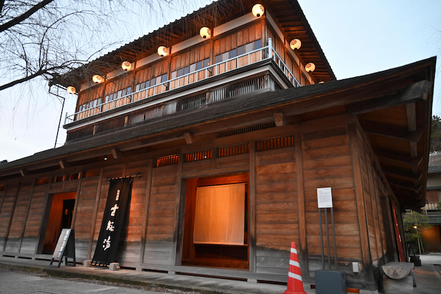 「界 加賀」の目の前には、明治時代の共同浴場を忠実に再現した古総湯があり、宿泊者は無料で利用することができます。扉を開けてすぐ浴室が広がる光景はまるで当時にタイムスリップしたかのよう。カランやシャワーがなく入浴方法も当時のままで、かけ湯をして湯船に入ります。