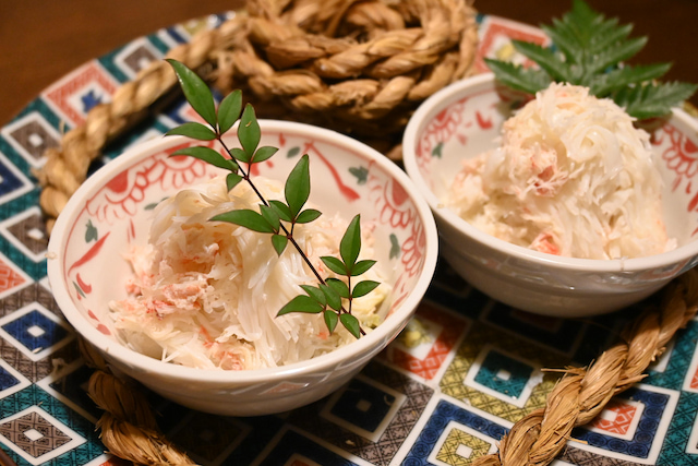 目玉は、「界 加賀」が編み出した「活蟹のしめ縄蒸し」。江戸時代の調理法からヒントを得たもので、生きたままのカニを縄でぐるぐる巻きに締めて蒸し上げます。縄を介して間接的に加熱するので、うま味と水分が失われず、しっとりとしたカニ本来の味を余すところなく味わえます。