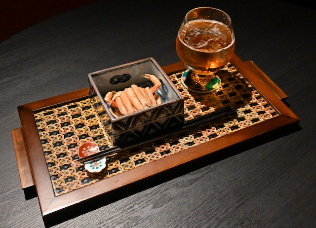 蟹面がすっぽり収まる上品な模様の器と九谷焼の華やかな模様がフットプレートに描かれた丸いグラスが運ばれてきて、思わずうっとり。