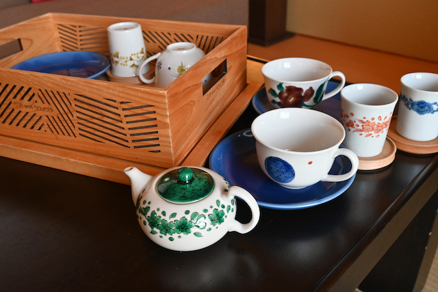 ルームプレートやルームキーホルダー、茶器には地元作家が手掛けたオリジナルの九谷焼、障子には上品な水引があしらわれるなど加賀の伝統工芸の息吹をたっぷりと感じられる空間となっています。湯上がりに九谷焼の茶器で温かいお茶を飲んだり、好きな時間に露天風呂に入ったりと自分だけのリラックスタイムを過ごすことができました。