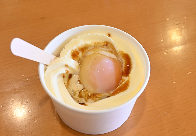 湯上がりにおすすめなのが山代温泉名物の「温玉ソフトクリーム」(450円)。