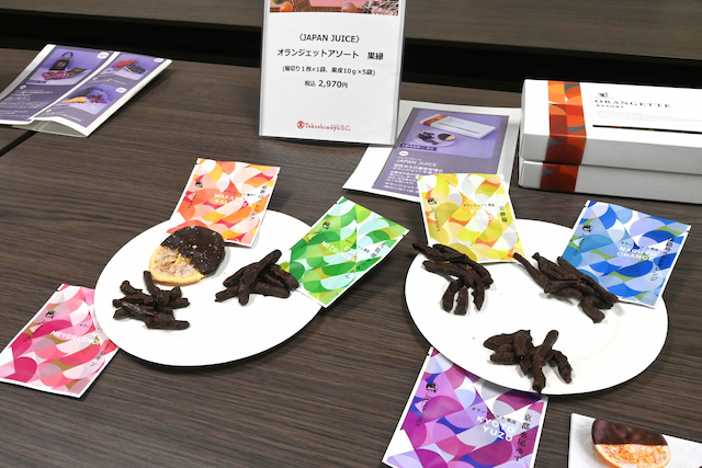 砂糖とたっぷりの果実で密漬けにした近畿地方産の6種の柑橘を、ダークチョコレートで包んだオランジェットは、甘さや酸っぱさ、ほろ苦さなど柑橘の種類によって異なるので、食べ比べを楽しめます。
