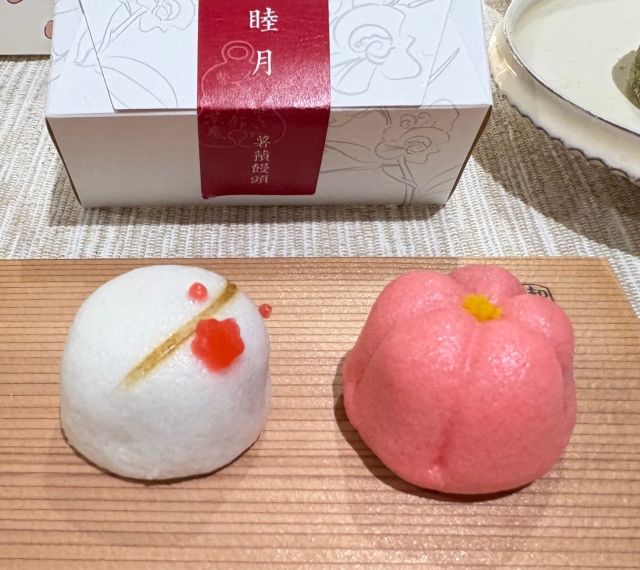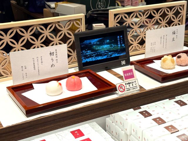 まずお目当てにしたいのが、阪急うめだ本店限定の「薯蕷(じょうよ)饅頭」。オープン時は新年にふさわしく、紅白の梅をモチーフにした「初うめ」が登場。かわいいパッケージには、あずきの花がデザインされています。