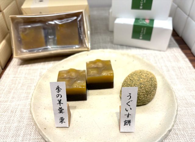 左から「季(とき)の羊羹 栗」(2個)600円、「うぐいす餅」(2個)500円