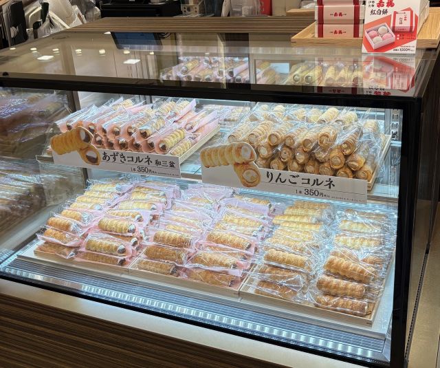 左から「あずきコルネ和三盆クリーム」「りんごコルネ」各1本350円 -