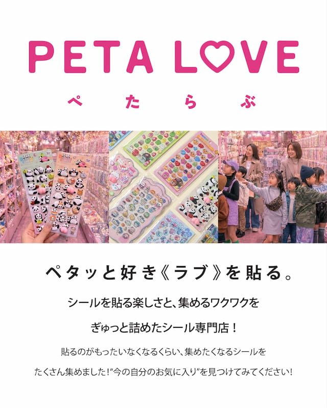 シール帳に貼ったり、ノートや手帳をデコレーションしたり、キーホルダーや小物にアレンジしたりなど、さまざまな楽しみ方ができるシール。「PETA L♡VE」は、そんなシールの「貼る楽しさ」と「集めるワクワク」を大切に、今の“お気に入りの一枚”に出会えるシール専門店です。
