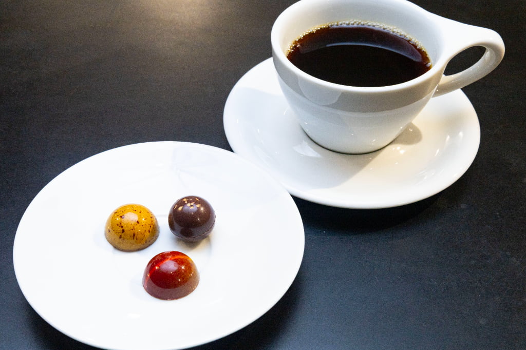 カフェで楽しめるのは「Too Caramel」「Too Ganache」「Too Praline」の3種のショコラセット。写真は「Too Caramel」で、フランク・ケストナー、プラン クール、フィリップ・ベルの新作3種を一度に味わえるのが魅力です。合わせるコーヒーは、期間前半が「小川珈琲」、後半が「喫茶葦島」。ショコラとコーヒー、香りのペアリングも楽しめます。