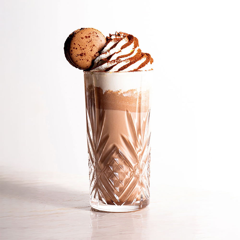 「ピエール・エルメ・パリ」が提供するのは、冷たいチョコレートドリンク「フラッペ マカロン アンフィニマン ショコラ」。カカオ67%のビターチョコレートが効いた、ほろ苦さがクセになる一杯です。