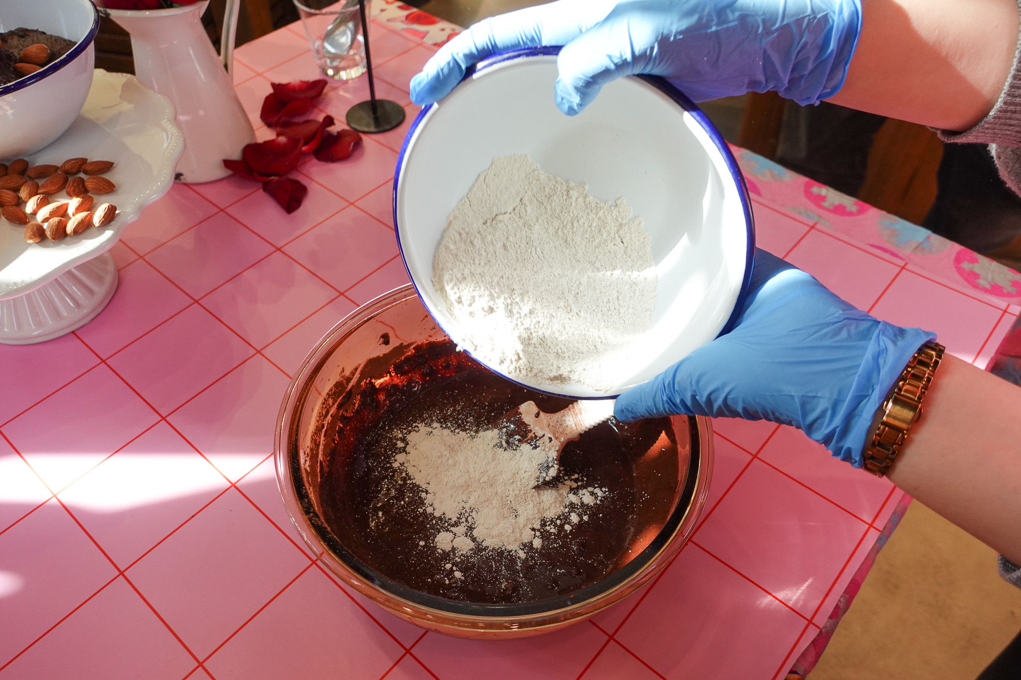 次にカカオパウダーを3回に分けて投入。少しずつココアの香りがふわっと立ち上がり、作業しながら思わず深呼吸したくなるほどです。さらに天然の泥・カオリンを加えて、しっかりと混ぜ合わせていきます。カオリンは毛穴汚れを吸着して取ってくれる役割があるそう。