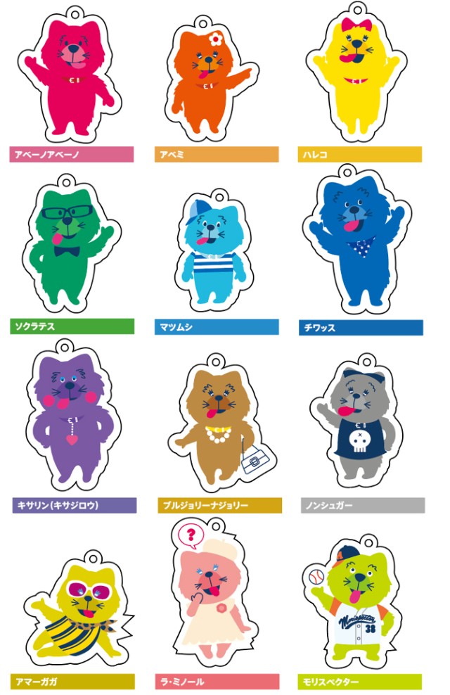 「アベーノアベーノ」たちがカプセルトイ専門店「#C-pla」に登場し、15周年限定のアクリルキーチェーンが販売されます。