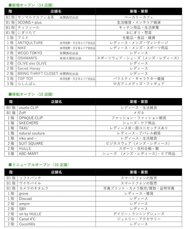 ニューオープン、リニューアルオープンを含めた全店リストは以下の画像でご紹介します!