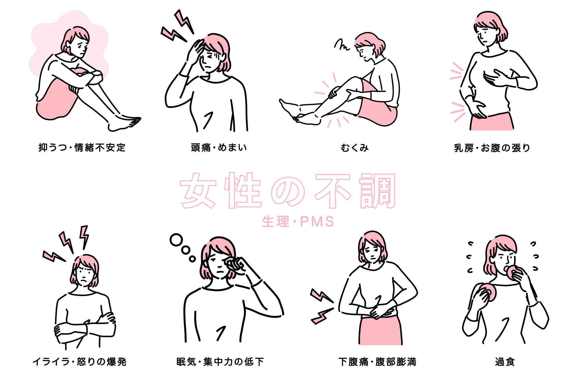 PMSは月経周期に伴い、痛みやむくみ、イライラ感や気持ちの落ち込み、食欲増進など、300種類以上の症状があるとされます。多くは月経開始とともに軽減・消失します。