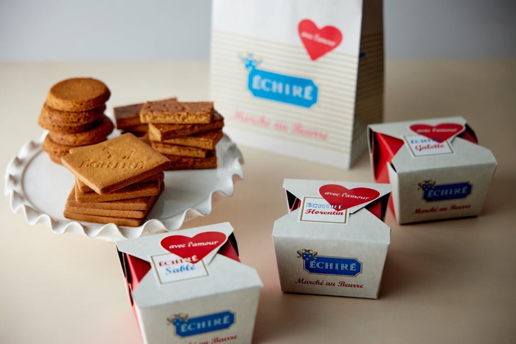 また、3月中旬までのバレンタイン&ホワイトデー期間は、「サブレ・エシレ(6枚入)」「ガレット・エシレ(6枚入)」「フロランタン(8枚入)」を、赤いハートのモチーフに「avec l’amour」のメッセージを添えた限定デザインのボックスで販売。ショッパーにも同様のデザインを施しています。