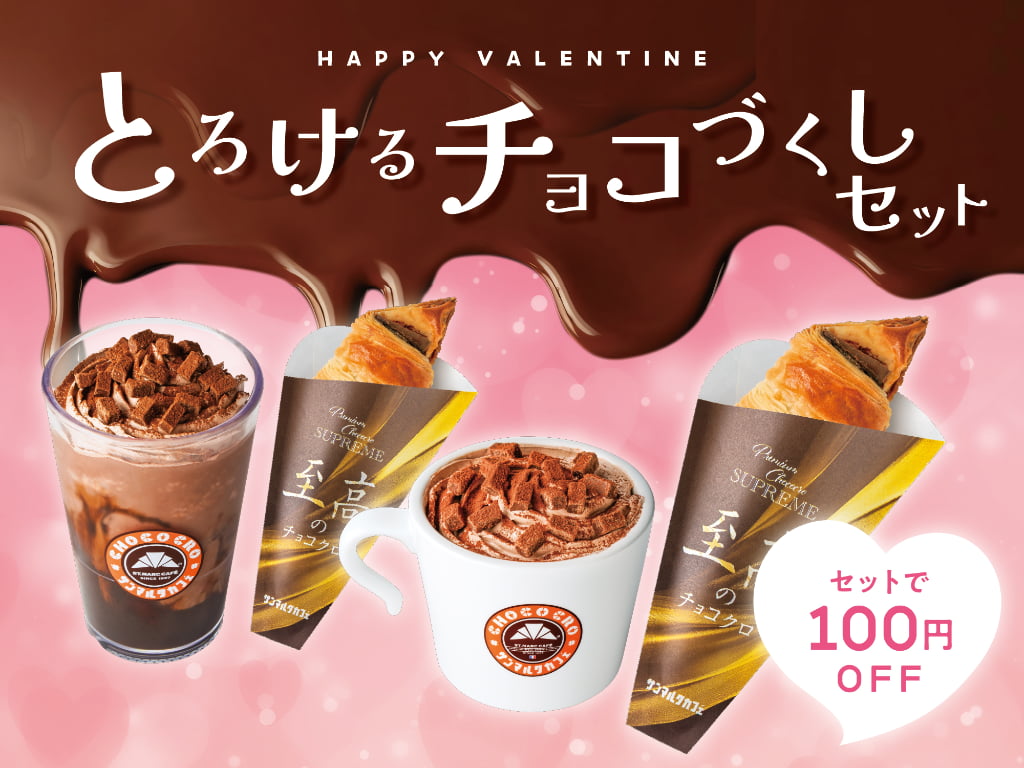 また、2026年2⽉3⽇(⽕)〜2⽉16⽇(⽉)限定で、「⾄⾼のチョコクロ」とショコラドリンク各種がセットで100円引きとなる「とろけるチョコづくしセット」も登場します。チョコレート好きにはたまらない組み合わせです♡