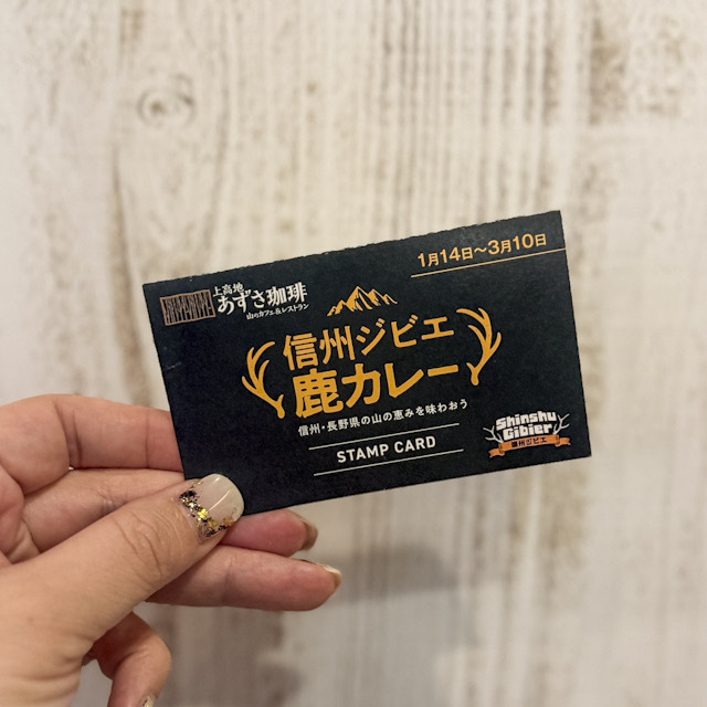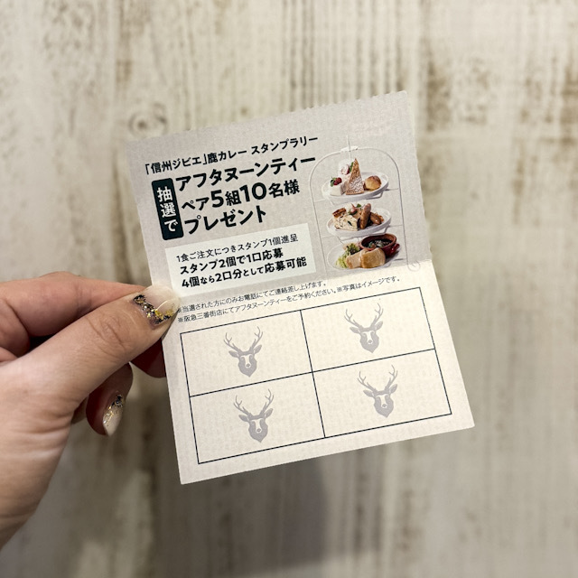 「信州ジビエカレーフェア」では、「上高地あずさ珈琲」の人気メニュー「アフタヌーンティー」が当たるスタンプラリーを開催! スタンプは1食注文につき1個押印、スタンプ2個で1口、4個なら2口分の応募が可能です。