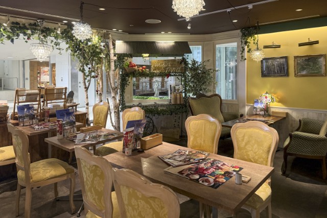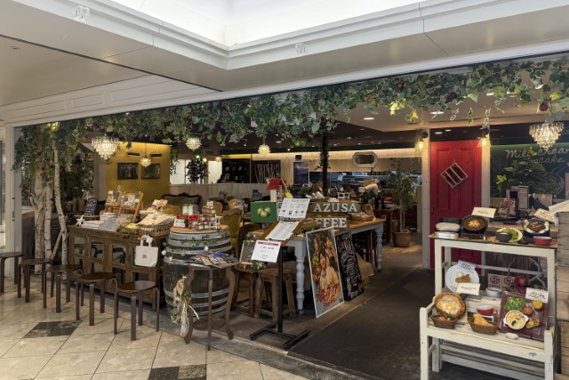 関西で13店舗を展開する「上高地あずさ珈琲」は、長野県の食材にこだわり、山小屋リゾートをイメージした人気店。店舗調理が自慢のため、ランチ使いからティータイム、ディナーまでいつでも利用しやすい気軽さに加え、店頭に並ぶ長野の特産品も、魅力のひとつです。