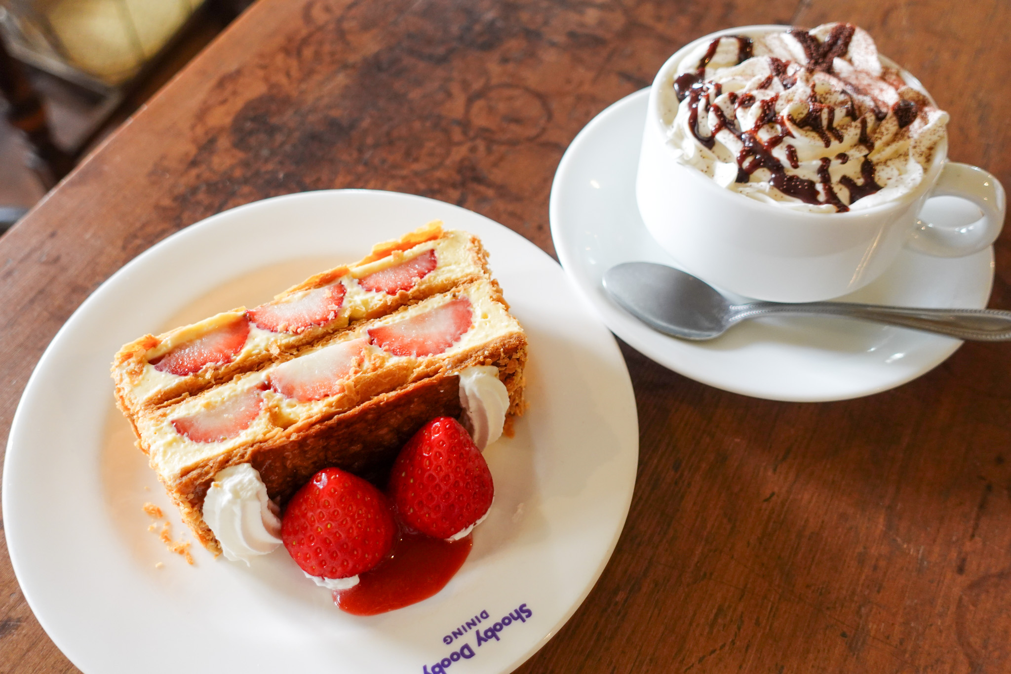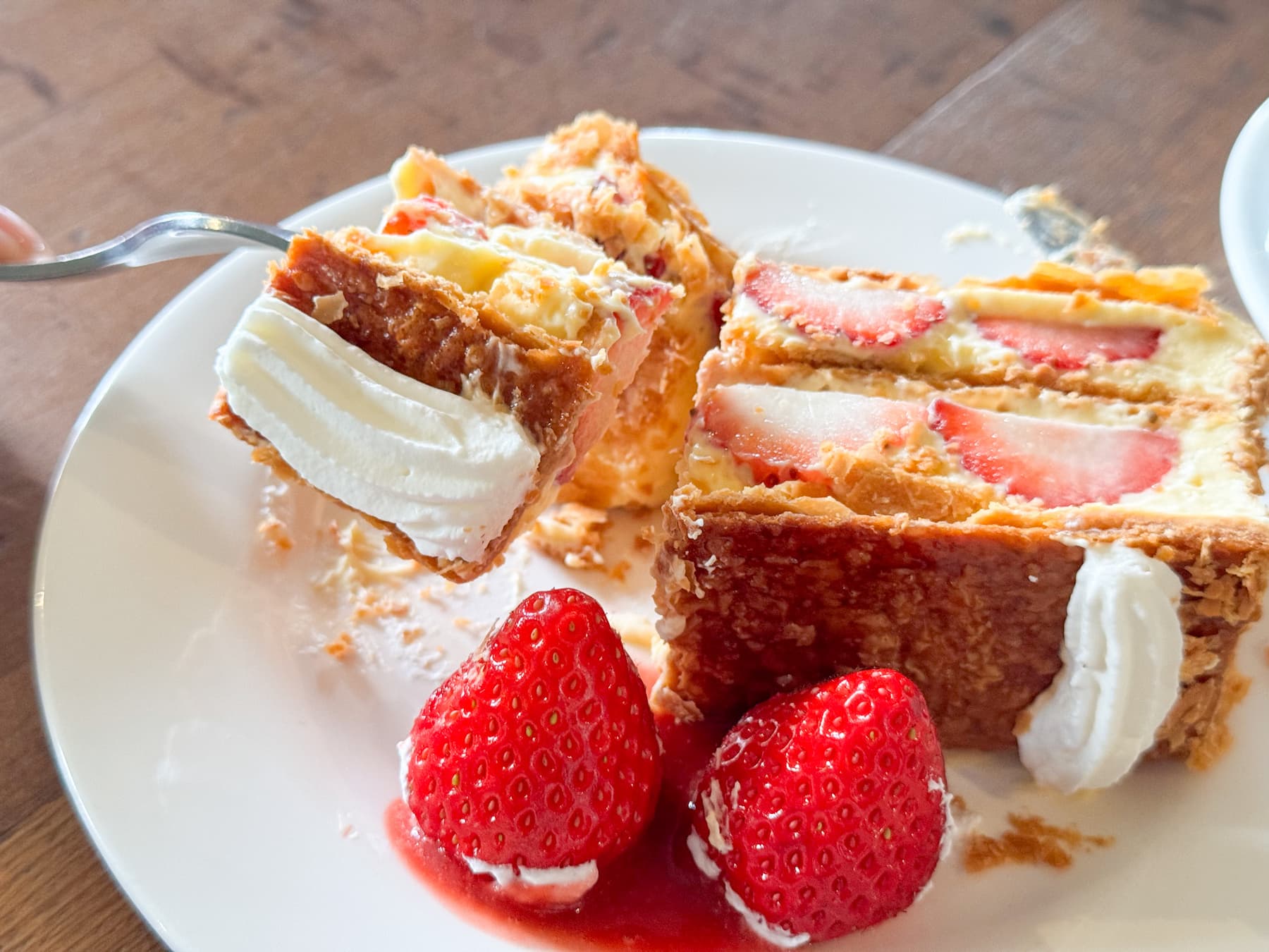 ここに来たら絶対に味わってほしいのが、旬のフルーツを贅沢に使った、数量限定の「ナポレオン・パイ」。キャラメリゼされたザクっと食感のパイに、なめらかな自家製の生クリームとカスタードクリームをたっぷりと重ね、甘いいちごをぎっしりとサンドしています。思わずうっとりと眺めてしまうほどの美しい断面は、まさに“萌え断”そのもの……♡