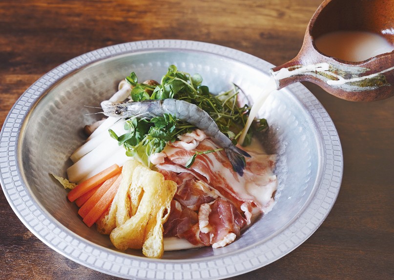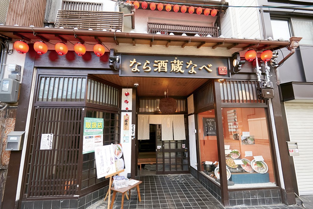 古い町屋をリノベーションした、寒い冬の夜にぴったりな鍋居酒屋「なら酒蔵なべ」。地産地消にこだわり、奈良の食材をふんだんに使用した料理が楽しめます。なかでもイチオシのメニュー「酒粕玄人鍋」。御所市・油長酒造「風の森」の酒粕と、大和肉鶏を使用した鶏ガラスープを合わせた唯一無二の出汁が自慢です。利き酒師が選ぶ奈良の地酒と共に楽しんで。