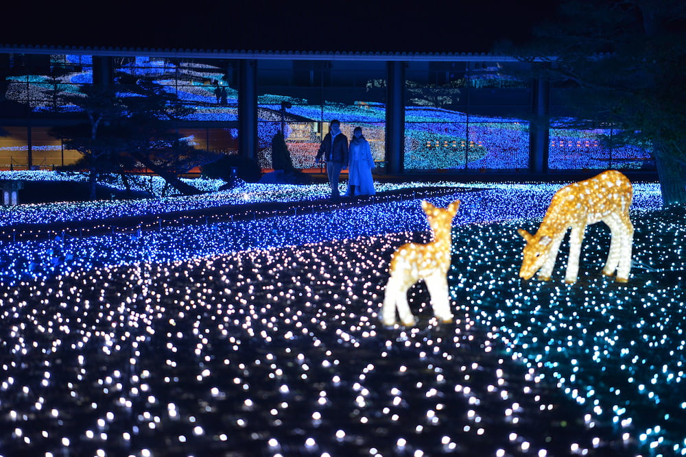 「しあわせ回廊 なら瑠璃絵」は、2010年から奈良公園一帯で開催されているイルミネーションイベント。瑠璃色の光がつくり出す幻想的な空間が訪れる人を魅了します。メイン会場となる「冬七夕ロード(有料エリア)」では、奈良春日野国際フォーラム 甍~I・RA・KA~ 庭園をライトアップ。入場時に購入した花たんざくは、願い事を書いて、庭園内に設置された冬七夕ツリーにかけることができます。