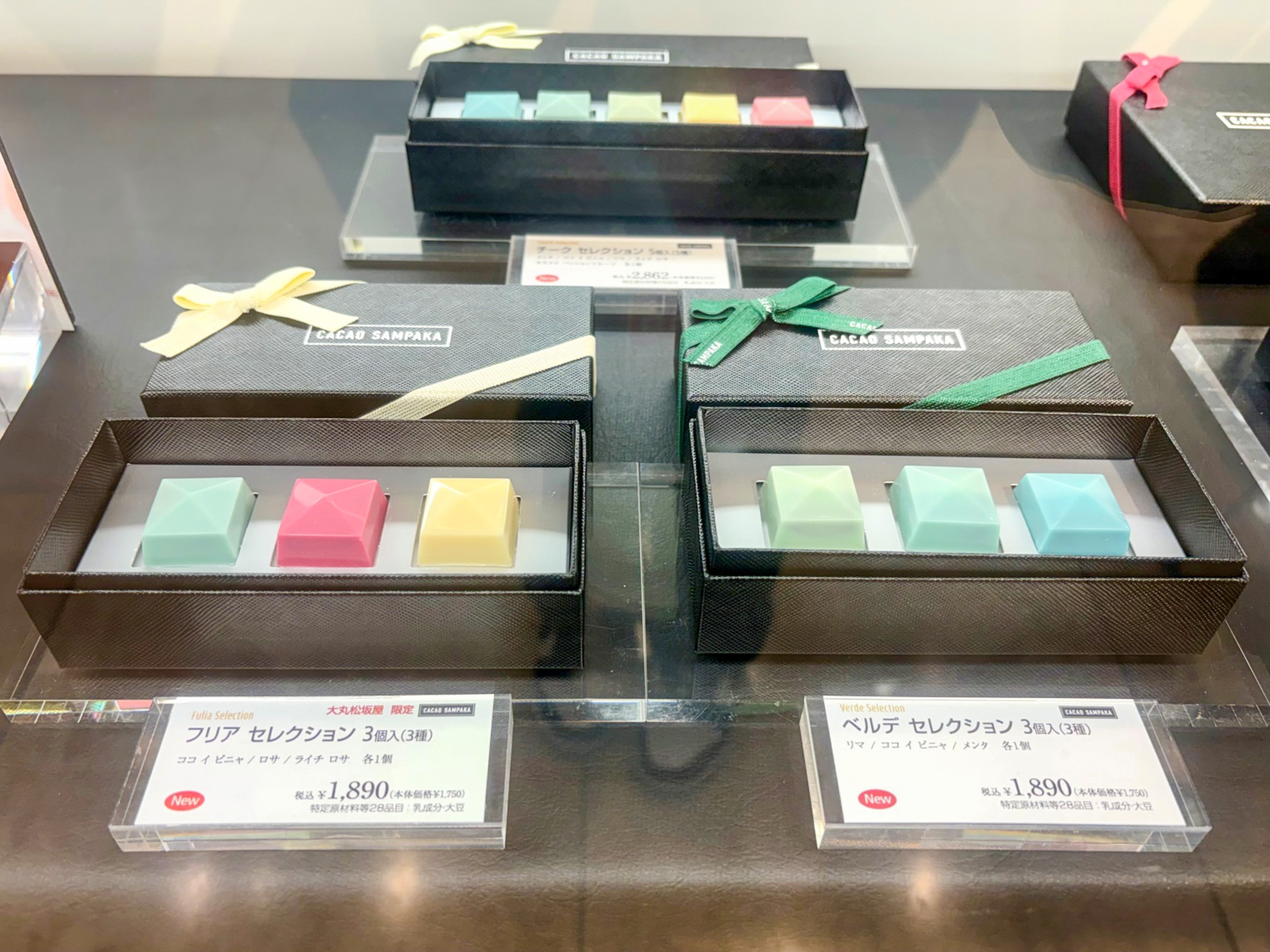 注目は、「⼤丸松坂屋」限定商品の「フリア セレクション」。宝石のようなフォルムに、フルーツのみずみずしさやローズの香りが楽しめるボンボンチョコレートの詰め合わせで、その華やかなビジュアルは贈り物にぴったりです。