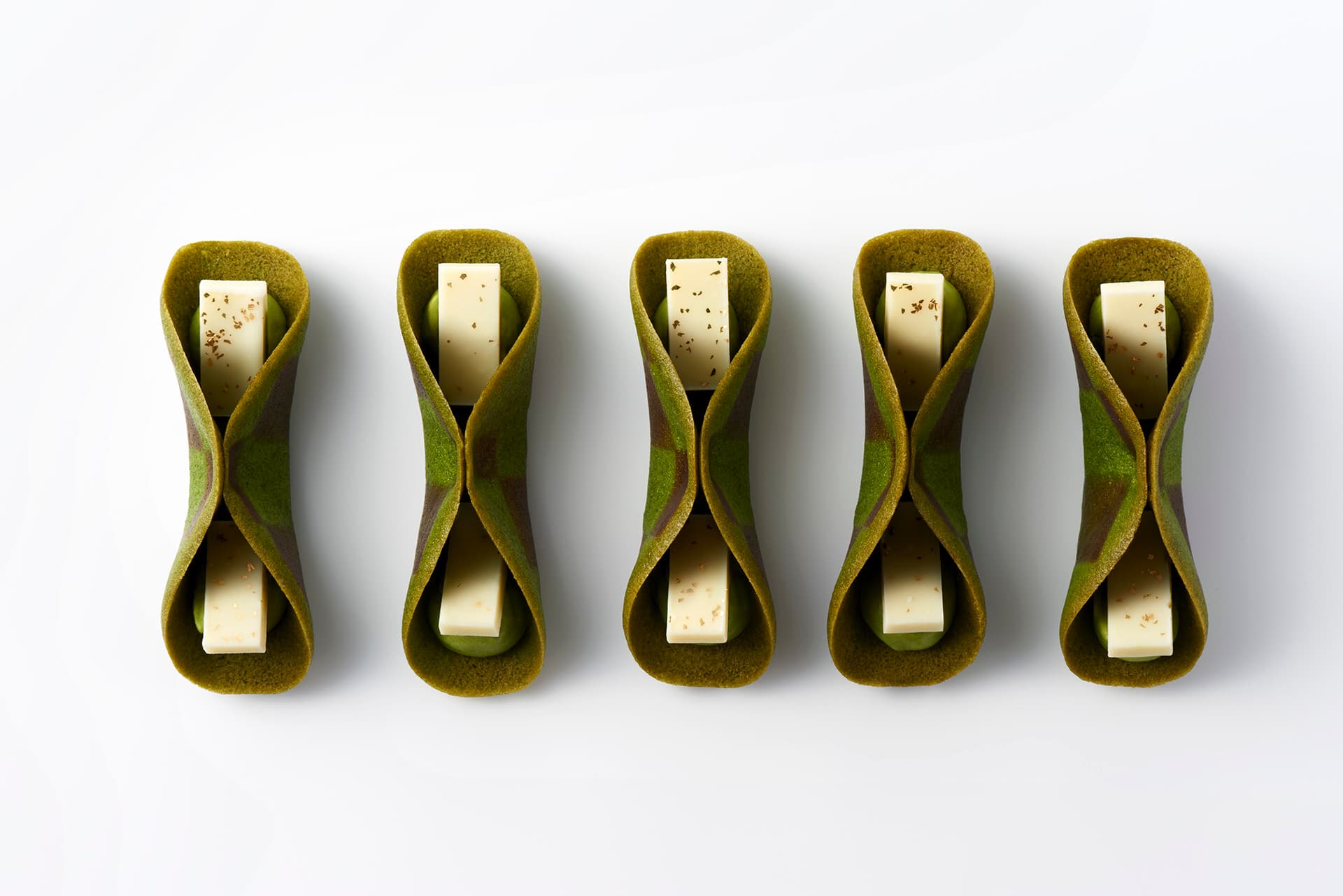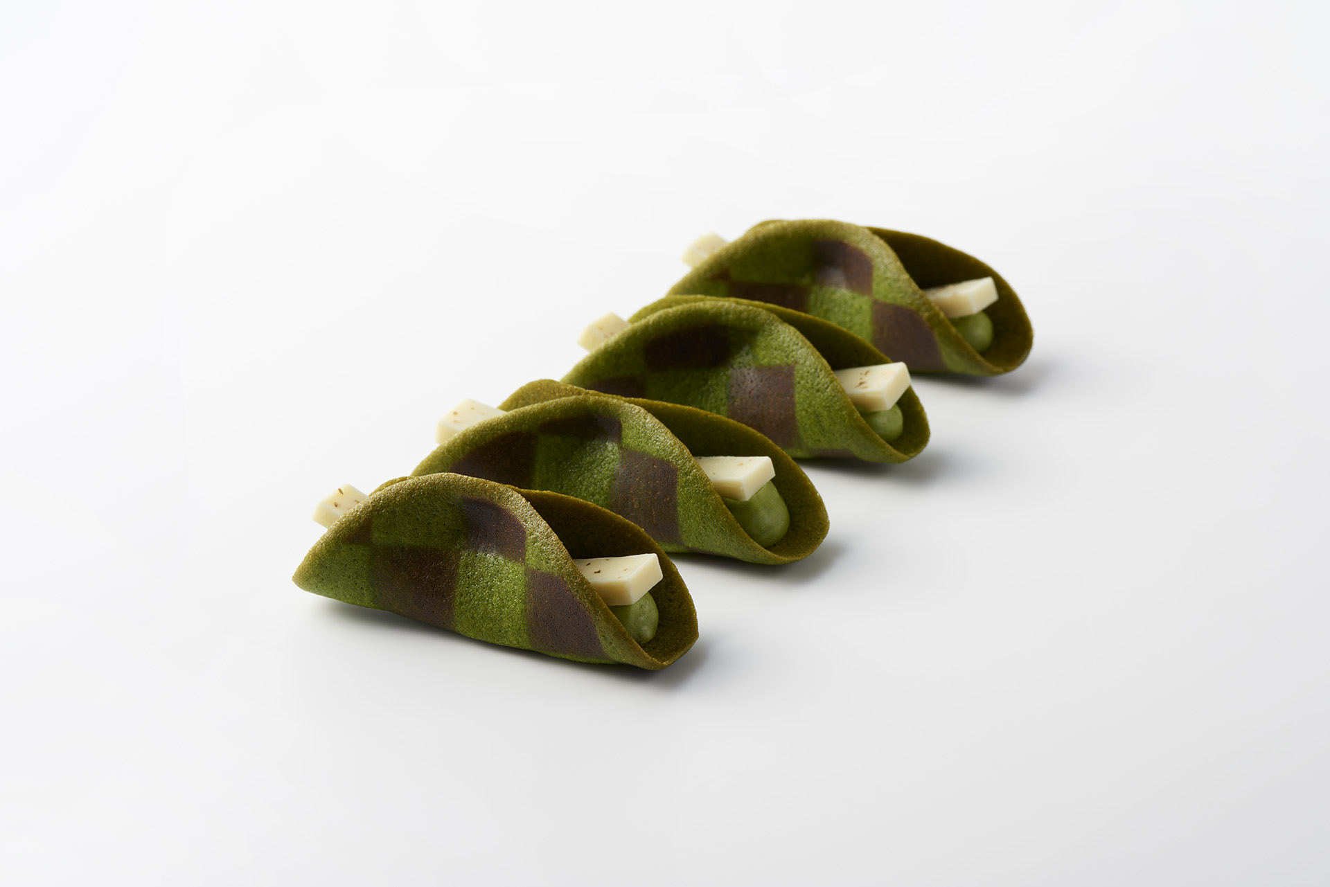 格子模様のラングドシャに抹茶クリームとホワイトチョコを飾り、チョコにあしらわれた金粉も目をひく華やかさ。使用しているのは、京都・宇治の伝統的な被覆栽培と石臼挽きにより生まれた鮮やかな深緑色の宇治抹茶で、抹茶の香りが最大限に花開く150度で焼き上げているそう。