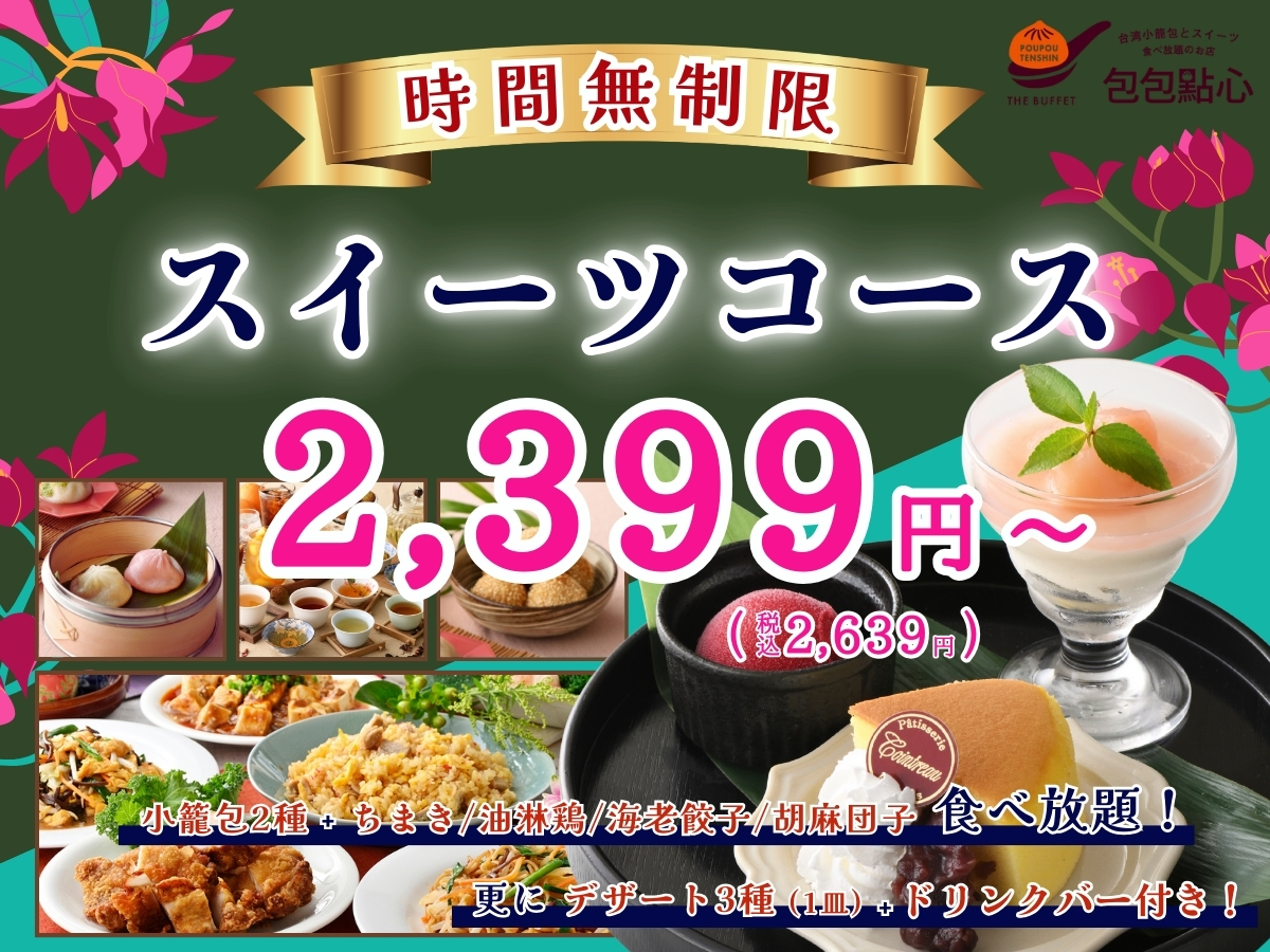 「THE BUFFET 包包點心」は、「自家製台湾小籠包」をはじめとした本格中華を食べ放題で楽しめるお店。今回は、ブッフェ料理はもちろんのこと、人気の点心やスイーツも時間無制限で楽しめるお得なコース「スイーツコース」をご紹介します。
