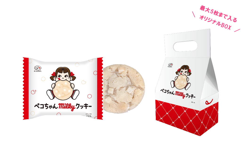 ゴロッとしたホワイトチャンクチョコがたまらない「ペコちゃんmilkyクッキー」は、待望の詰め合わせBOXが新登場。最大5枚まで入るBOXに好きな枚数を詰め合わせて購入できます。