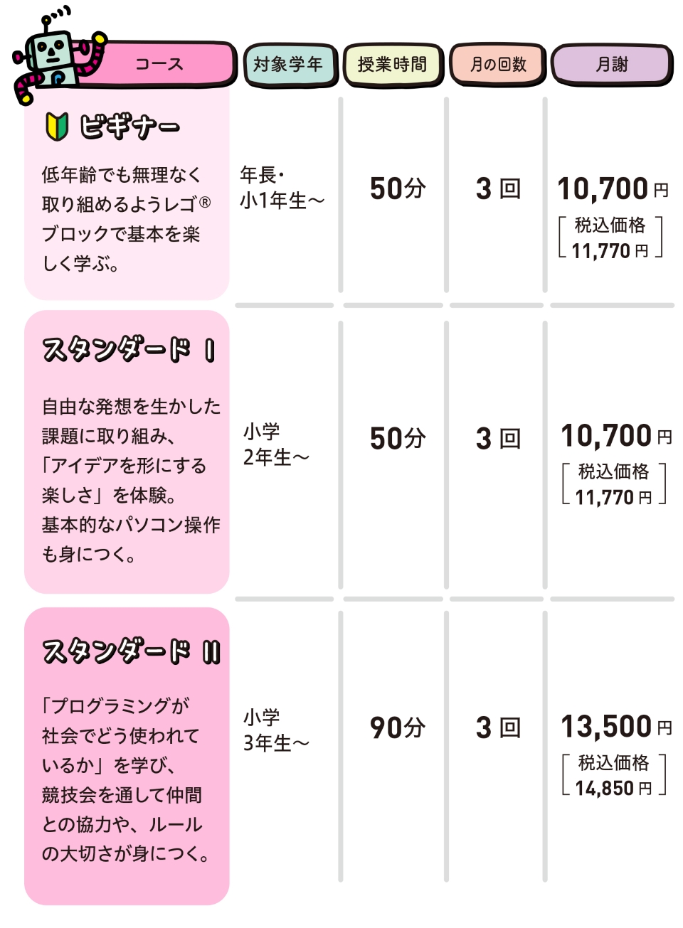 「ロボットやタブレットを使うって、きっと高そう」そんなイメージをいい意味で裏切ってくれるのが、プログラボの料金設定。入学金不要で、ロボットやタブレットなどの教材費も月謝に含まれているのも大きなポイント。将来に活かせる学びとしては比較的リーズナブルで、コスパの良さが光ります!