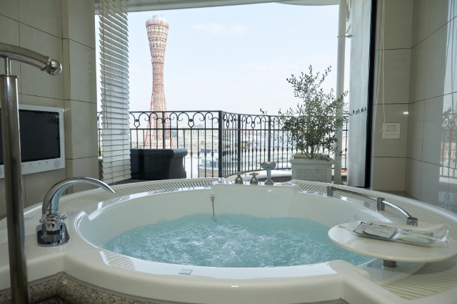 目の前の神戸港を行きかう船や神戸ポートタワーが眺められるビューバスこそ、こちらの客室を選びたくなる理由。入浴しながら絶景が眺められるのはもちろん、ジャグジーが楽しめたり、アメニティにバスソルトが準備されていたりと、優雅なバスタイムを叶えてくれます。