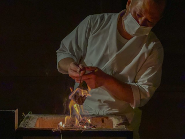 宿の夕食としてはもちろん、一般利用もできるここは、まさに美食家たちの隠れ家。カウンターの目の前で料理を仕上げる圧巻のライブ感が、料理への期待を高めてくれます。