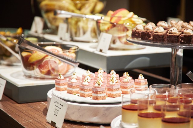 デザートエリアには、フレッシュフルーツからケーキ、グラスデザートまで、さまざまなスイーツがずらり。 -