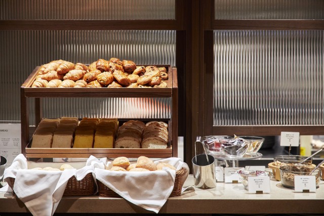 パンは約8種がそろい、トースターで温めていただけます。朝食メニューにうれしいシリアルなども充実。 -