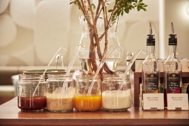 4種類のドレッシングにビネガー、バルサミコ、オリーブオイルなども用意。 -