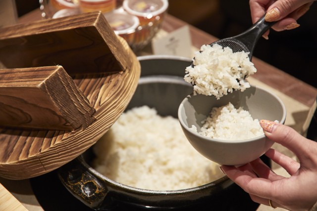 釜からごはんをよそえば、おいしさもアップ!? 漬物や明太子といったごはんのお供も豊富なので、何度でもおかわりしてしまいそう。 -