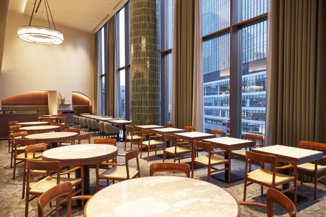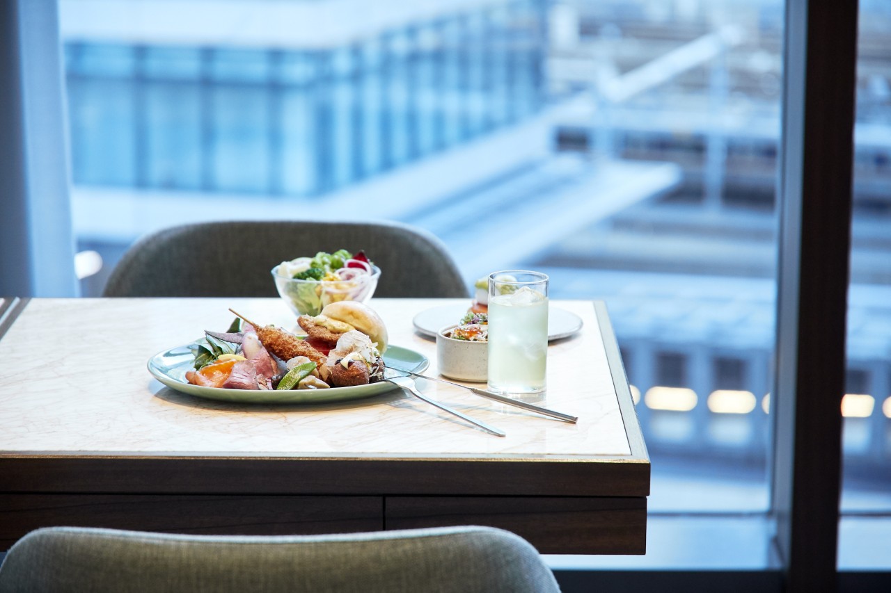 モーニングブッフェの魅力をさらに高めてくれるのが、店内のぜいたく空間。ブッフェ台に近いシックなエリアも、JR大阪駅に発着する電車を眺められる窓際席も、どちらも開放的な特等席です。