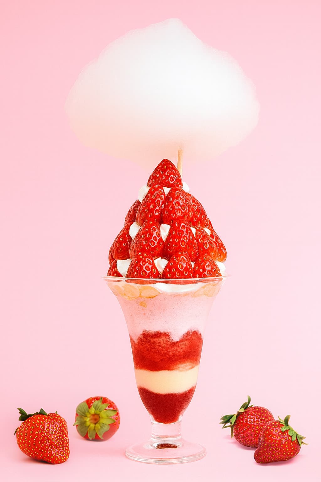 そのほか、いちごとチョコレートを使った「DIVERTENTE」のイベント限定ピッツァや、推しカラーのいちご型容器が選べる「STRAWBERRY HOUSES」のいちごミルク、⾃家製いちごソースとムース、フレッシュいちごを⼭盛りに重ね、大胆にわたあめをのせた「ふるーつなのに」のパフェなど、個性派も勢ぞろい!