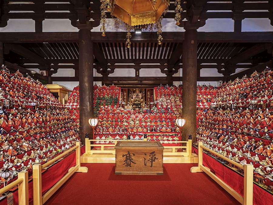 大宝3年(703年)創建、西国三十三所第六番札所や眼病封じのお寺として知られる古刹「壺阪寺」では、町家のひな祭りに合わせて「大雛曼荼羅」を公開(2026年2月28日(土)~4月18日(土))。全国から奉納されたひな人形約4,500が大講堂内に美しい曼荼羅を描きます。
