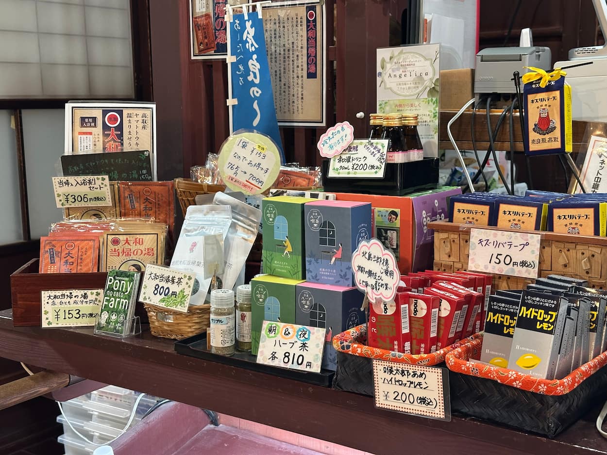 大正時代に呉服屋として栄えていた旧山崎邸を改修した観光案内所「夢創舘」では、観光案内に加え、高取城に関するグッズや薬業が盛んな高取町ならではの薬草を使ったお茶など、地元の特産品を数多く取り扱っています。