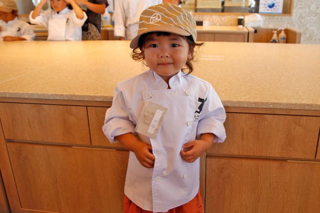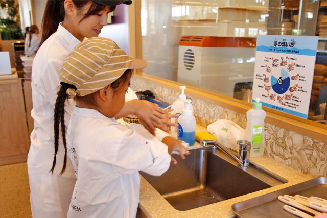 体験ではまずパティシェになるために、コックコートと帽子の制服を着用します。続いて、丁寧な手洗い方法を学びます。