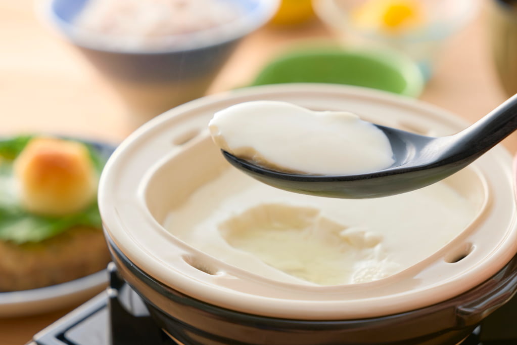 イソフラボンが1.5倍含まれる「ゆきぴりか大豆」の豆乳を使用した「ふく福豆冨定食」は、お店のおすすめメニューのひとつ。卓上で火にかけられ目の前で仕上げられるお豆腐は、できあがるまでのワクワク感とともに、できたてならではの「大豆の甘み」「香り」「ふわとろ食感」も楽しめます。