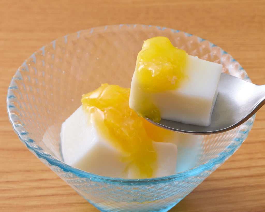 定食のデザートでは、梅の花で人気の「もっちり嶺岡」がスタンバイ。牛乳、生クリーム、葛粉などのシンプルな材料を使用し、じっくり練って作られた嶺岡豆腐をシロップに漬け込んだ、梅の花オリジナルスイーツです。