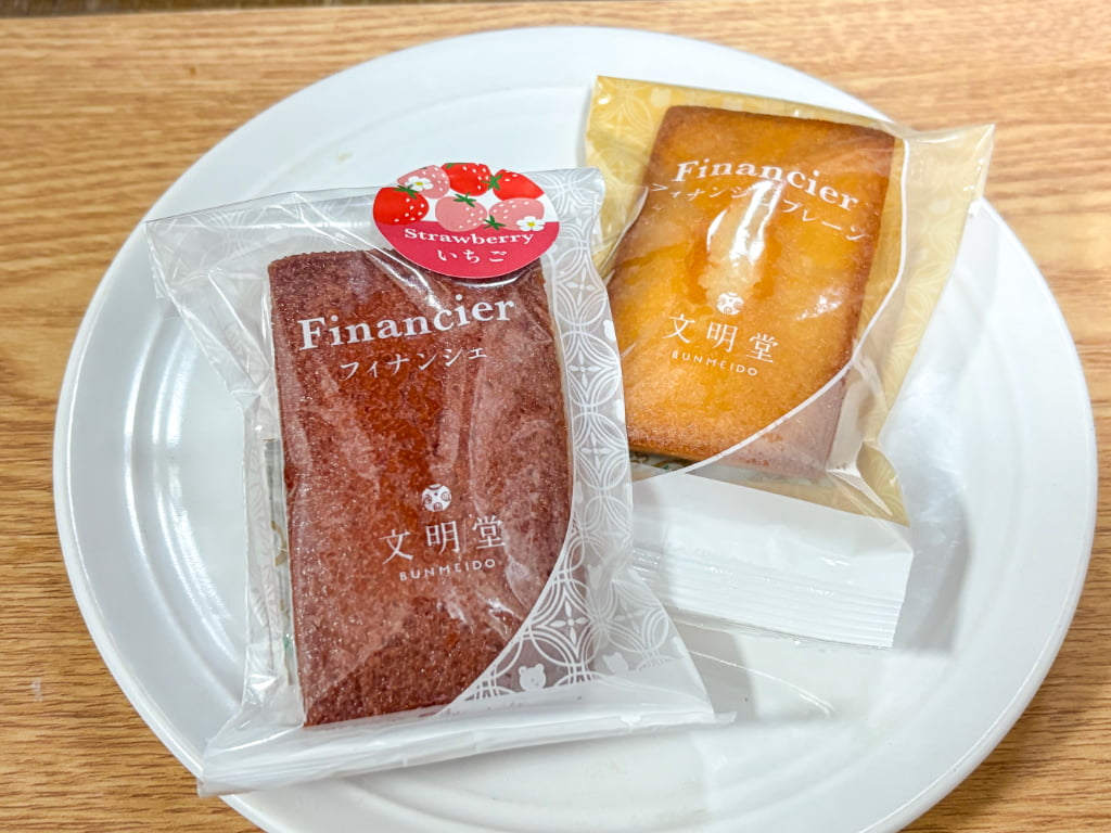 洋菓子では「フィナンシェ」のプレーンやいちごが登場。しっとりした口当たりの人気商品です。「伏見カステラ工房の三笠山」と「フィナンシェ」は、オープン時刻の9:00から用意。ほかの商品は焼き上がり次第、店頭に並びます。