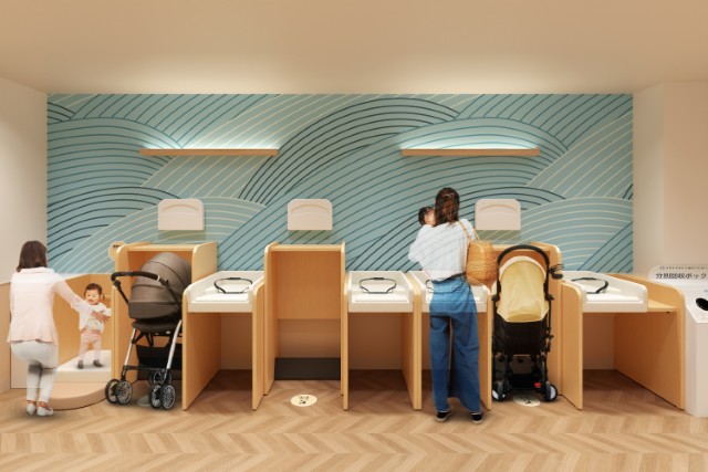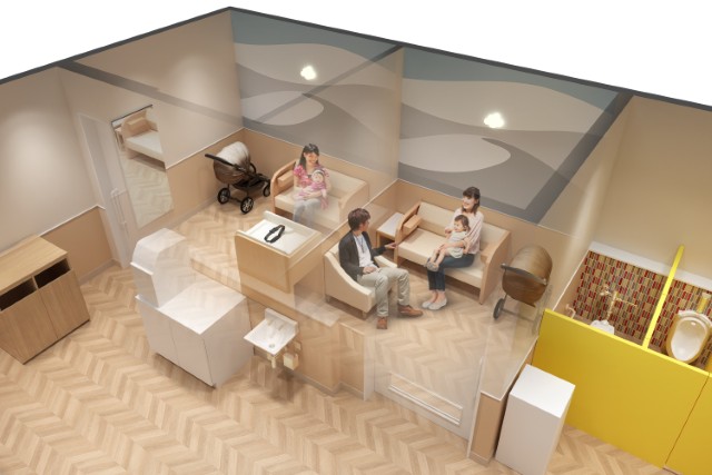 ベビーカーで使いやすいおむつ台や、お子さんの着替えがしやすい着替え台、授乳イス・授乳ソファの一新など、ファミリーにとってうれしい、使いやすいベビールームとして機能性もアップ。