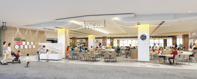 施設3階にあるフードコートの名称を「FOOD PARK(フードパーク)」に改名し、和泉市の豊かな自然をテーマにした、温かみを感じられるデザインに刷新。エントランスゾーンはきらめく光や自然をモチーフに、ゆったりと食事を楽しめる空間になりました。