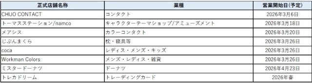 また、「WORKMAN Plus」が「Workman Colors」の新業態へと変身するほか、既存店舗の「ミスタードーナツ」、「トーマスステーション/namco」なども装いを新たに進化します。