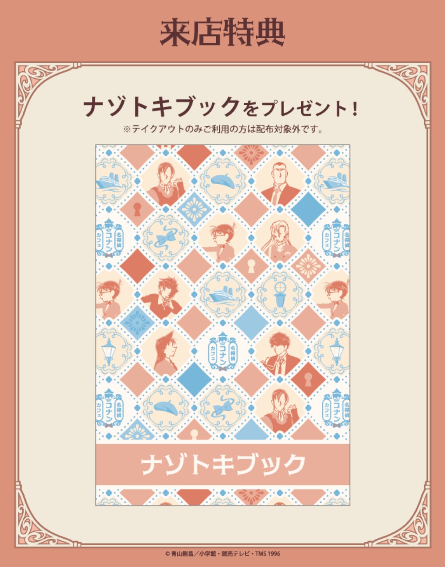 さらに、来店してメニューを注文した人には「ナゾトキブック(全1種)」、ドリンクを注文した人には「オリジナルコースター(ランダム12種)」を用意。ドリンク注文特典は、前期・後期でデザインが変わります。