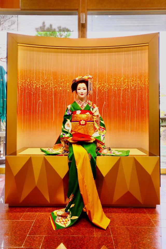 店内には、舞妓ロボット「茶ト加(ちゃとか)」による抹茶でのおもてなしというユニークな演出も。京ことばで語りかける「茶ト加」と一緒に、写真を撮るのもOK。ステージの背景は、華やかな和紙や季節の植物が彩ります。