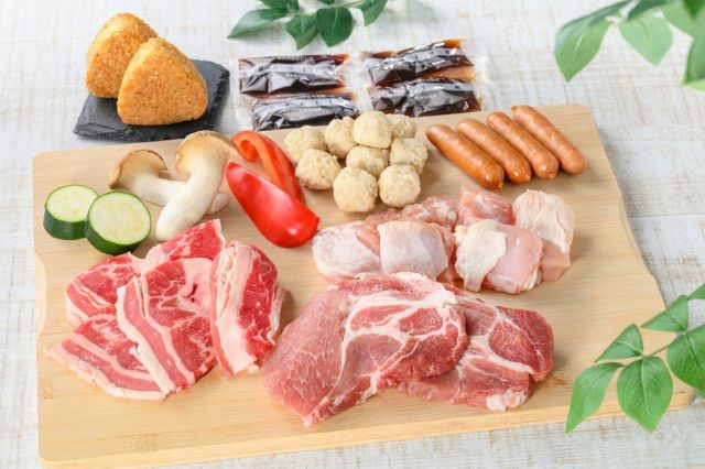 内容:カルビ50g、豚肩ロース100g、鶏100g、つくね50g、ソーセージ、焼きおにぎり、焼き野菜、焼き肉のたれ