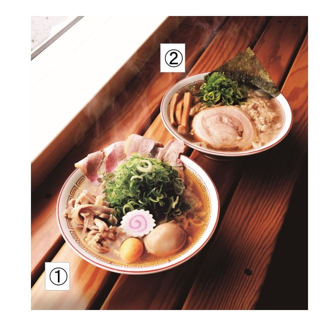 【あべのハルカス近鉄本店初登場】山形「新旬屋本店」の(1)「金の鶏中華 ハルカス限定全部入り」(1杯/1,741円)※あべのハルカス近鉄本店限定、(2)「シンチャンらーめん」(1杯/1,100円)※各日限定数50 ※ともにイートイン -